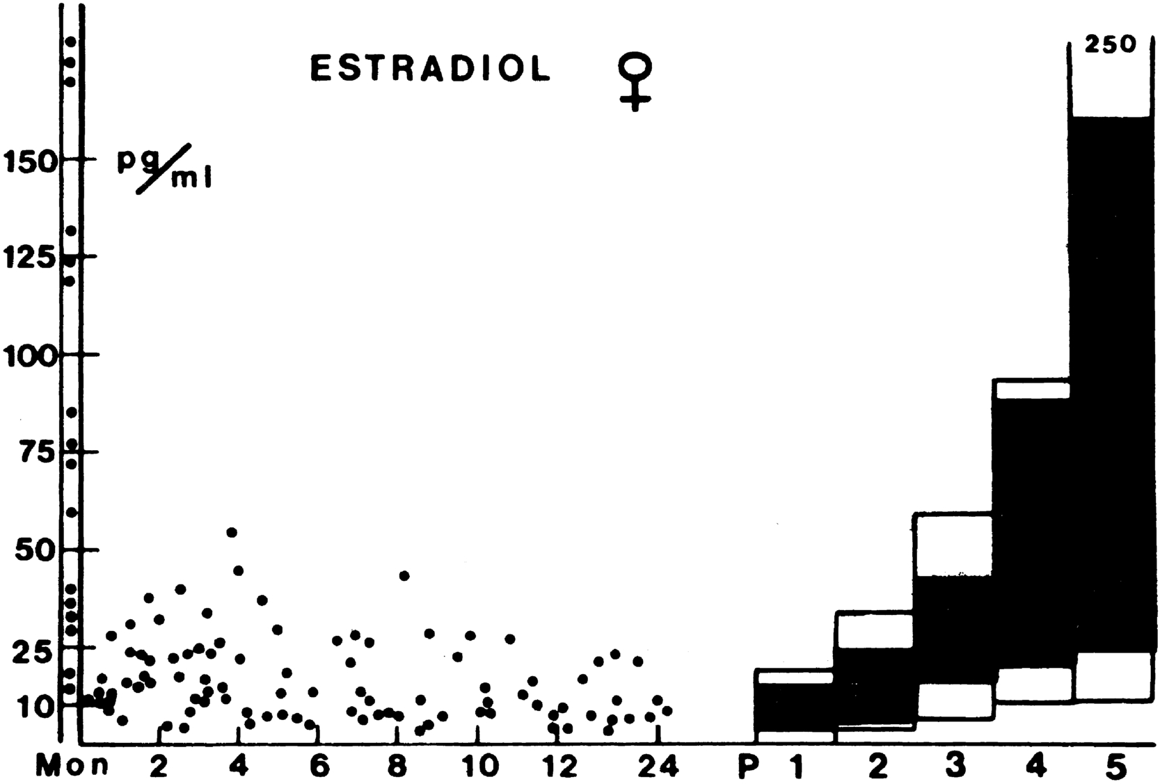 Hình 16.8 Phân bố nồng độ estradiol huyết tương ở trẻ sơ sinh nữ so với nồng độ ở nữ giới tuổi dậy thì và trưởng thành. Các cột đại diện cho khoảng giá trị bình thường cho các giai đoạn khác nhau của dậy thì. Vùng giữa phân vị thứ 10 và 90 có màu tối. Giai đoạn P1 bao gồm tất cả các bé gái tiền dậy thì lớn hơn 2 tuổi. Các giá trị giữa các trục tung được tìm thấy trong khoảng từ 2 đến 5 ngày tuổi. (Từ Bidlingmaier, F., Knorr, D. (1978). Oestrogens: physiologic and clinical aspects. Pediatr Adolesc Endocrinol, 4, 41–84.)