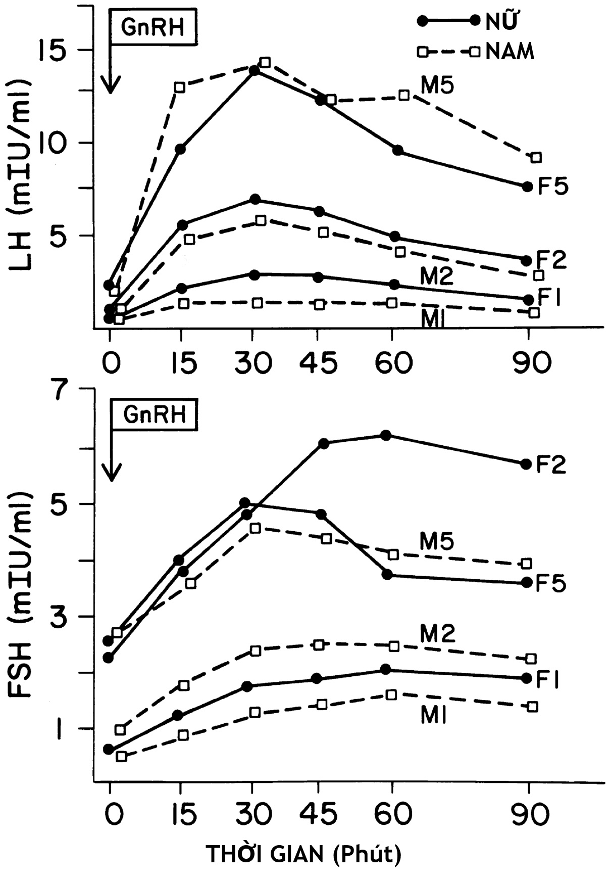 Hình 16.9 Đáp ứng của hormone tạo hoàng thể (LH) và hormone kích thích nang trứng (FSH) với một liều bolus hormone giải phóng gonadotropin (GnRH) (50 mcg/kg/ngày) ở nam (M) và nữ (F) trong giai đoạn tiền dậy thì (tuổi 5–6: F1, M1), dậy thì sớm (F2, M2), và dậy thì muộn (F5, M5). Các đáp ứng với GnRH có xu hướng tiến triển cùng với sự tiến triển của dậy thì. Tuy nhiên, các bé gái dậy thì sớm có một lượng FSH dự trữ dễ giải phóng lớn hơn so với các thanh thiếu niên tiến triển hơn. Đáp ứng đỉnh của các bé gái có xu hướng lớn hơn một chút so với các bé trai ở các giai đoạn tương đương. (Chỉnh sửa với sự cho phép từ Ehrmann et al, Polycysticovary syndrome as a form of functional ovarian hyperandrogenism due to dysregulation ofandrogen secretion. Endocr Rev. 1995;16:322–353.)