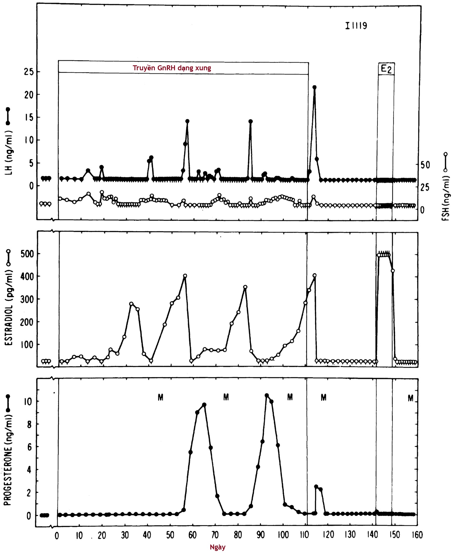 Knobil sau đó đã chỉ ra rằng có thể gây dậy thì ở khỉ rhesus cái chưa trưởng thành bằng cách tiêm GnRH theo các xung hàng giờ tạo ra nồng độ trong máu khoảng 2000 pg/mL. Việc tiêm GnRH kéo dài theo phác đồ này đầu tiên dần dần gây ra sự gia tăng thoáng qua của LH và FSH. Điều này sau đó gây ra sự phát triển nang trứng theo chu kỳ. Sự tăng estradiol vừa phải sau đó có cường độ đủ để gây ra kinh nguyệt do chảy máu kinh nguyệt do ngưng thuốc trong một chu kỳ không rụng trứng (Hình 16.10). Việc tiếp tục cùng một phác đồ GnRH dẫn đến sự phát triển của các kỳ kinh nguyệt rụng trứng hàng tháng bình thường. Các xung GnRH sinh lý ở người có thể đạt nồng độ thấp hơn (200 pg/mL) và xảy ra ở khoảng cách rộng hơn một chút so với ở khỉ. Do đó, các xung LH ở phụ nữ trưởng thành xảy ra ở khoảng cách khoảng 1.5 giờ trong giai đoạn nang trứng, chậm lại trong giai đoạn hoàng thể.