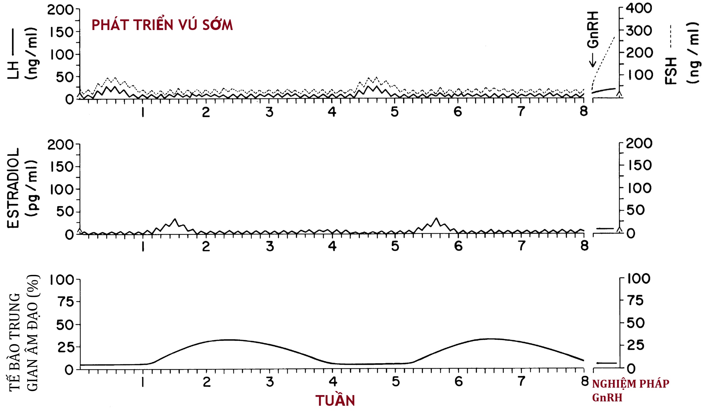 Hình 16.11 Sơ đồ mô tả giả thuyết làm việc của chúng tôi về các mô hình nội tiết ở các bé gái trong giai đoạn dậy thì rất sớm. Chúng tôi hình dung mô hình này xảy ra cả theo chu kỳ trong giai đoạn sớm nhất của dậy thì bình thường và đôi khi trong dậy thì sớm không bền vững (tức là hầu hết các trường hợp phát triển vú sớm vô căn ở Hoa Kỳ). Nồng độ hormone trong huyết thanh ban ngày và ban đêm (gonadotropin so với tiêu chuẩn LER-907) và tỷ lệ tế bào trung gian trên phết tế bào âm đạo được hiển thị. Đáp ứng điển hình với nghiệm pháp hormone giải phóng gonadotropin (GnRH) được minh họa. Các chu kỳ nội tiết cận lâm sàng kéo dài khoảng 1 tháng là kết quả của vài ngày tăng bài tiết hormone kích thích nang trứng (FSH) và hormone tạo hoàng thể (LH). Bởi vì động lực giải phóng gonadotropin tương đối yếu, sản xuất FSH và LH bị ức chế nhanh chóng và trong một thời gian dài bởi một lượng estradiol (E2) khiêm tốn. Estradiol chỉ có thể phát hiện được trong huyết tương trong vài ngày mỗi tháng. Tuy nhiên, sự trưởng thành của niêm mạc âm đạo có thể phát hiện được trong khoảng 2 tuần sau khi sản xuất E2 đã giảm.