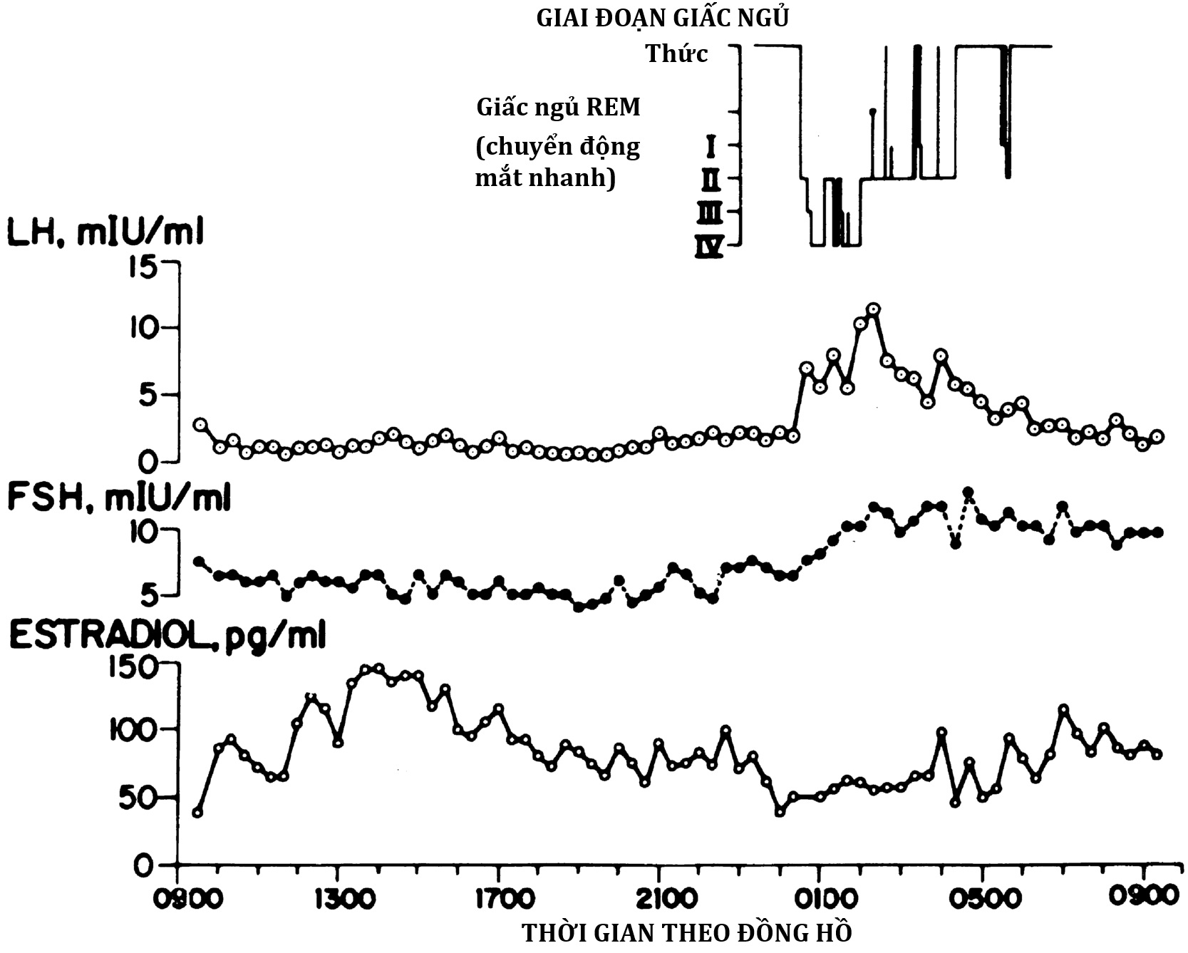 Dậy thì tiến triển khi LH tăng. Trong khi nồng độ FSH huyết thanh tăng khoảng 2.5 lần trong suốt quá trình dậy thì, nồng độ LH tăng 25 lần hoặc hơn. Sự thay đổi ban đầu trong bài tiết LH vào đầu tuổi dậy thì là sự gia tăng bài tiết LH hàng đêm bắt đầu trong vòng 20 phút sau khi bắt đầu ngủ. Sau đó, LH tăng nhiều hơn khi bắt đầu ngủ, duy trì ở mức cao lâu hơn và giảm ít hơn trong giờ thức. Khi trẻ đến gần tuổi có kinh, nồng độ LH ban ngày tiếp tục tăng cho đến khi nhịp điệu ngày đêm thường bị mất đi. Nồng độ FSH theo một mô hình tương tự, mặc dù những thay đổi của FSH ít nổi bật hơn. Nhịp điệu ngày đêm của gonadotropin trong tuổi dậy thì dường như hoàn toàn liên quan đến giấc ngủ, không giống như nhịp điệu sinh học của cortisol. Có một độ trễ khoảng 12 giờ giữa mức LH đỉnh trong khi ngủ và đỉnh estradiol, do đó nồng độ estradiol đạt tối đa vào khoảng cuối buổi sáng đến đầu buổi chiều. Nhịp điệu gonadotropin và estradiol ở một bé gái dậy thì sớm được thể hiện trong Hình 16.12.