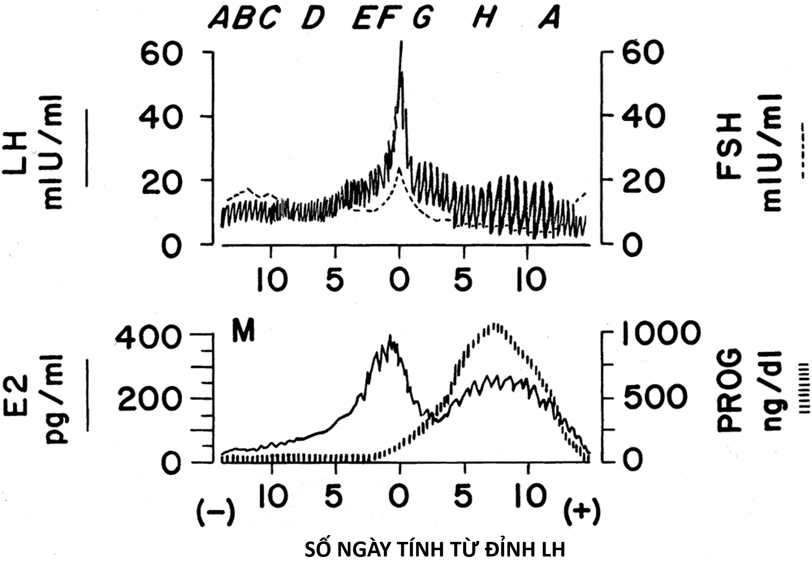 Hình 16.13 Sơ đồ nồng độ gonadotropin và hormone nữ trong chu kỳ kinh nguyệt bình thường. Các mức được đặt trung tâm tham chiếu đến ngày đỉnh hormone tạo hoàng thể (LH) giữa chu kỳ (ngày 0). Các chữ cái từ A đến F phía trên bảng trên cùng tương ứng với các giai đoạn phát triển nang trứng trong Hình 16.14. G và H được thảo luận trong văn bản. M (bảng dưới cùng) cho thấy thời gian có kinh. E2, Estradiol; FSH, hormone kích thích nang trứng; PROG, progesterone. (Dữ liệu từ Abraham, G.E. (1974). Ovarian and adrenal contributions to peripheral androgens during the menstrual cycle. J Clin Endocrinol Metab, 39, 340; Ross, G.T., Cargille, C.M., Lipsett, M.B., Rayford, P.L., Marshall, J.R., Strott, C.A., Rodbard, D. (1970). Pituitary and gonadal hormones in women during spontaneous and induced ovulatory cycles. Recent Prog Horm Res, 26, 1; và Soules, M., Steiner, R., Clifton, D., Cohen, N., Aksel, S., Bremner, W. (1984). Progesterone modulation of pulsatile luteinizing hormone secretion in normal women. J Clin Endocrinol Metab, 58, 378.)