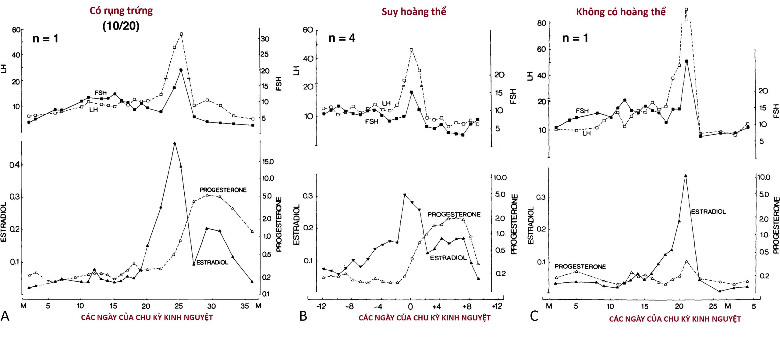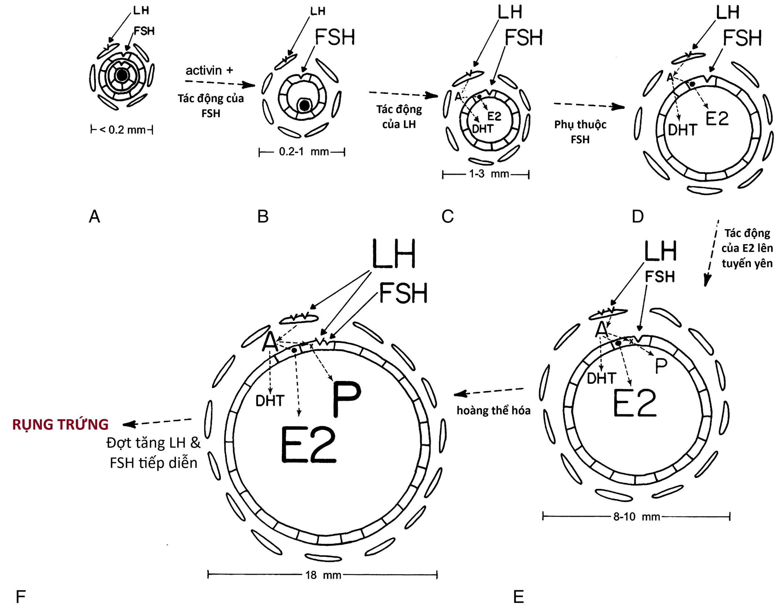 Giai đoạn nang trứng của mỗi chu kỳ kinh nguyệt tái hiện lại tuổi dậy thì ở nhiều khía cạnh. Nồng độ gonadotropin và hormone sinh dục thấp trong giai đoạn tiền kinh nguyệt của chu kỳ trưởng thành (Hình 16.13 A). Nồng độ gonadotropin sau đó tăng vào thời điểm có kinh, FSH chiếm ưu thế trong giai đoạn nang trứng sớm, trong khi nhịp xung LH về đêm chậm (Hình 16.13 B). Nhịp xung LH tăng lên theo mô hình circhoral (khoảng 1 giờ) quanh một đường nền ổn định, và sản xuất estradiol bắt đầu từ từ khi các nang trứng có hốc phát triển (Hình 16.13 C). Nồng độ estradiol tăng dần và nồng độ FSH huyết thanh giảm tương ứng (Hình 16.13 D). Khi hình thành một nang trứng vượt trội, nồng độ estradiol huyết thanh tăng theo cấp số nhân. Điều này bắt đầu khuếch đại một cách chọn lọc đáp ứng LH của tuyến yên với GnRH khi estradiol đạt khoảng 90 pg/mL trong hơn 3 ngày (Hình 16.13 E).