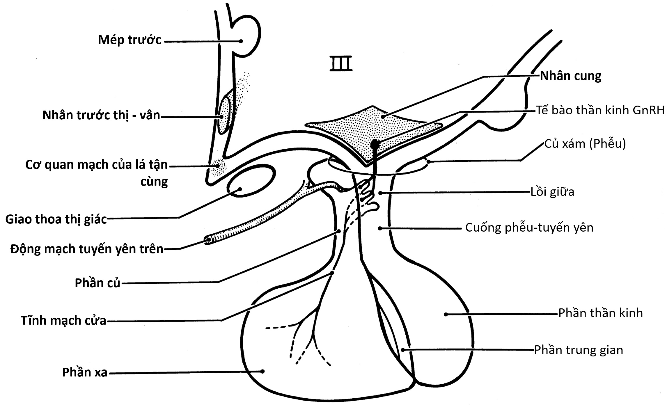 Thùy trước của tuyến yên, có nguồn gốc từ ngoại bì khoang miệng, và thùy sau, có nguồn gốc thần kinh, biệt hóa vào tuần thứ 11 của thai kỳ. Đến thời điểm này, các tế bào thần kinh GnRH đã di chuyển từ mảng khứu giác vào vị trí trong vùng dưới đồi nền giữa. GnRH vùng dưới đồi sau đó tăng song song với LH và FSH của tuyến yên và huyết thanh thai nhi. Tất cả đều đạt đỉnh vào khoảng 20 đến 24 tuần, khi các kết nối của hệ thống cửa tuyến yên hoàn tất, đạt đến mức độ mà chỉ thấy lại ở thời kỳ mãn kinh.