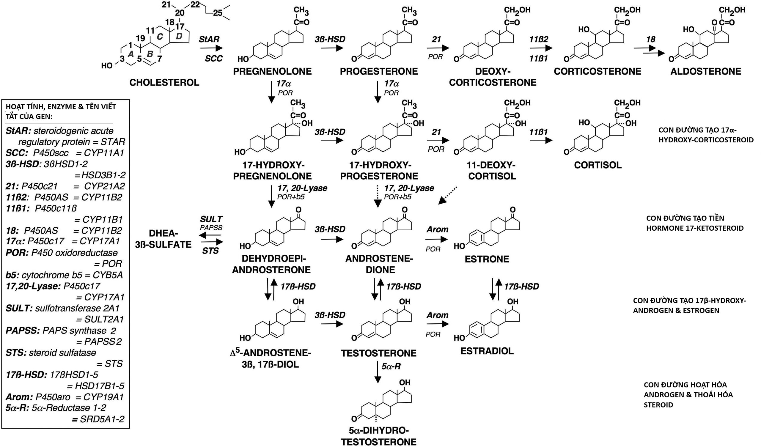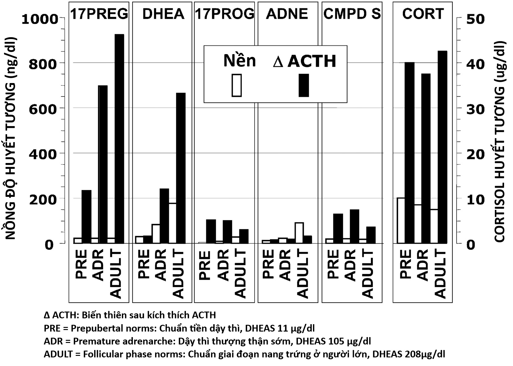 17PREG, 17-Hydroxypregnenolone; 17PROG, 17-hydroxyprogesterone; ACTH, hormone vỏ thượng thận; DHEA, dehydroepiandrosterone; GnRH, hormone giải phóng gonadotropin; FSH, hormone kích thích nang trứng; IV, tĩnh mạch; LH, hormone tạo hoàng thể; SC, dưới da.