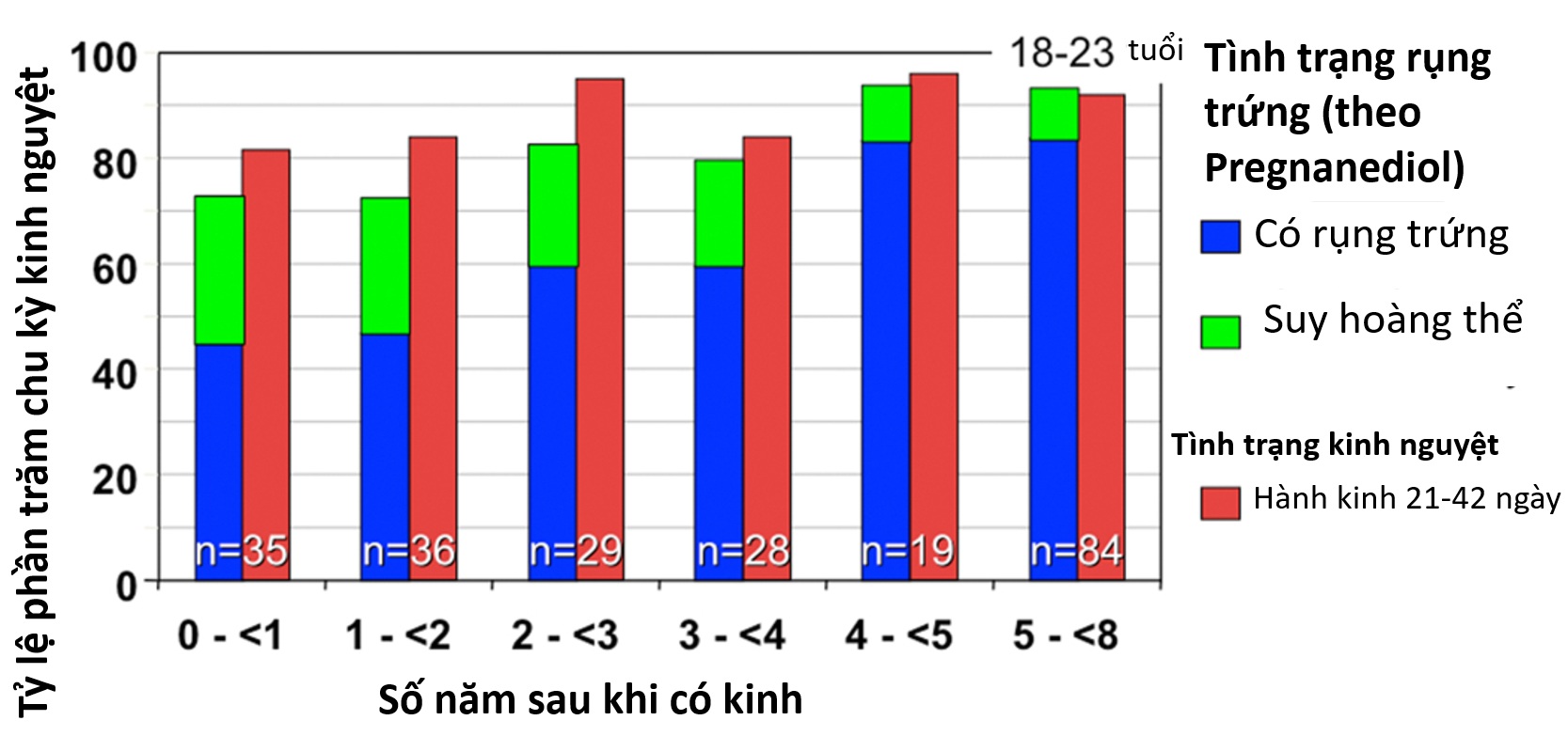 Kinh nguyệt không nhất thiết cho thấy sự trưởng thành hoàn toàn của trục thần kinh-nội tiết-buồng trứng. Như các nghiên cứu của Knobil minh họa (xem Hình 16.10), kinh nguyệt có thể do chảy máu do ngưng estrogen—và khoảng một nửa số trường hợp là như vậy—nhưng các chu kỳ rụng trứng có thể theo sau ngay sau đó. Các đặc điểm chung của buồng trứng trưởng thành được thể hiện trong Hình 16.4.