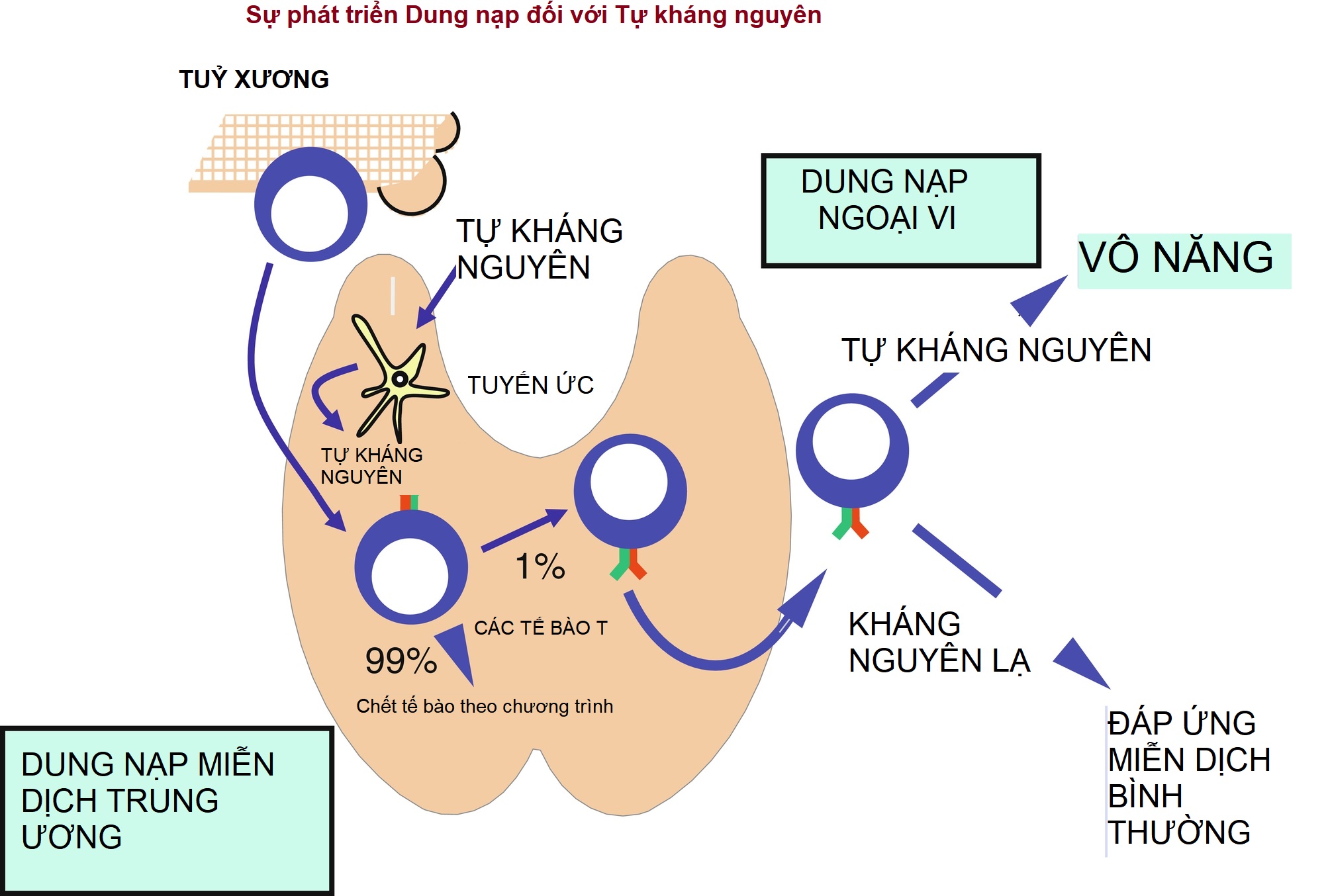 Một số giả thuyết khác nhau giải thích các khiếm khuyết trong dung nạp đã được đề xuất. Bệnh tự miễn có thể phát triển vì (1) dung nạp chưa bao giờ phát triển đối với các kháng nguyên tự thân cụ thể hoặc (2) dung nạp đã được thiết lập đã bị mất (Hình 22.3). Nếu kháng nguyên tự thân không được trình diện hiệu quả trong tuyến ức, dung nạp có thể không được thiết lập trong quá trình giáo dục tế bào T trong vỏ tuyến ức. Ví dụ, các đột biến AIRE dẫn đến việc thiếu biểu hiện các kháng nguyên tự thân lạc chỗ bởi các mTEC và sự trình diện của chúng cho các tế bào T đang phát triển. Điều này dẫn đến sự thoát ra của các tế bào T tự phản ứng ra ngoại vi và cuối cùng là bệnh tự miễn đa cơ quan. Một ví dụ khác là VNTR của gen insulin (INS) (số lượng lặp lại song song thay đổi), nằm khoảng 500 cặp base ngược dòng của promoter gen INS. VNTR INS ảnh hưởng đến sự biểu hiện và giáo dục tế bào T insulin trong tuyến ức dựa trên độ dài của nó. Cụ thể, các VNTR dài hơn có liên quan đến sự biểu hiện insulin trong tuyến ức tăng lên, và do đó giảm nguy cơ phát triển đái tháo đường tuýp 1, trong khi các VNTR ngắn hơn có liên quan đến sự biểu hiện insulin trong tuyến ức giảm, không thể xóa các dòng tế bào T tự phản ứng cụ thể, và tăng nguy cơ phát triển bệnh đái tháo đường.