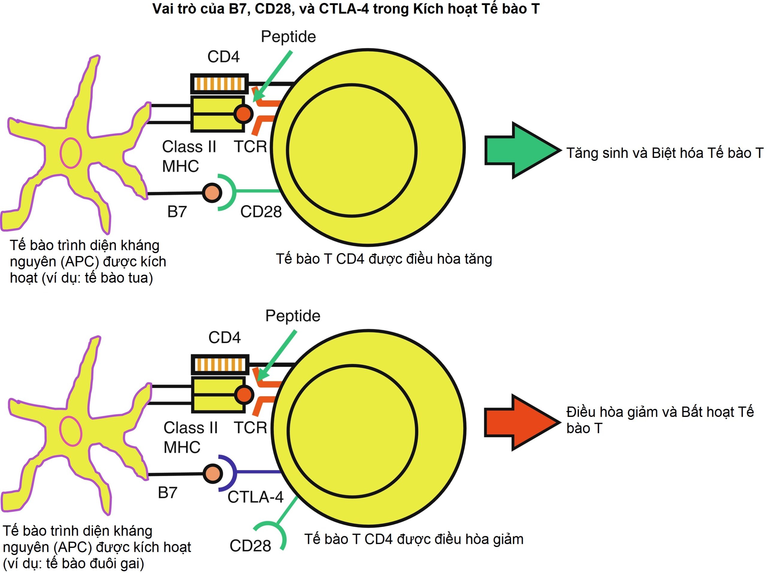 Khi các tế bào T nhận được cả hai tín hiệu (MHC-kháng nguyên với TCR và B7-CD28), một chuỗi các sự kiện truyền tín hiệu nội bào xảy ra, dẫn đến sự kích hoạt tế bào T. Các tế bào T CD8 gây độc tế bào được kích hoạt sẽ trung gian ly giải trực tiếp các tế bào đích, trong khi các tế bào T CD4 được kích hoạt dẫn đến sự biểu hiện của nhiều cytokine, thụ thể cytokine, và kháng nguyên 4 của tế bào T lympho gây độc tế bào (CTLA-4). CTLA-4 tương đồng với CD28 và cạnh tranh với CD28 để liên kết với B7.1/B7.2. Sự biểu hiện CTLA-4 bởi tế bào T được kích hoạt và sự tương tác của nó với B7.1/B7.2 cung cấp một tín hiệu ức chế miễn dịch/điều hòa miễn dịch cho tế bào T, do đó làm giảm các phản ứng của tế bào T. Do đó, CTLA-4 và CD28 mặc dù tương đồng, nhưng hoạt động đối nghịch: B7.1/B7.2-CD28 bật tế bào T, trong khi B7.1/B7.2-CTLA-4 làm giảm hoạt động của tế bào T (xem Hình 22.2).