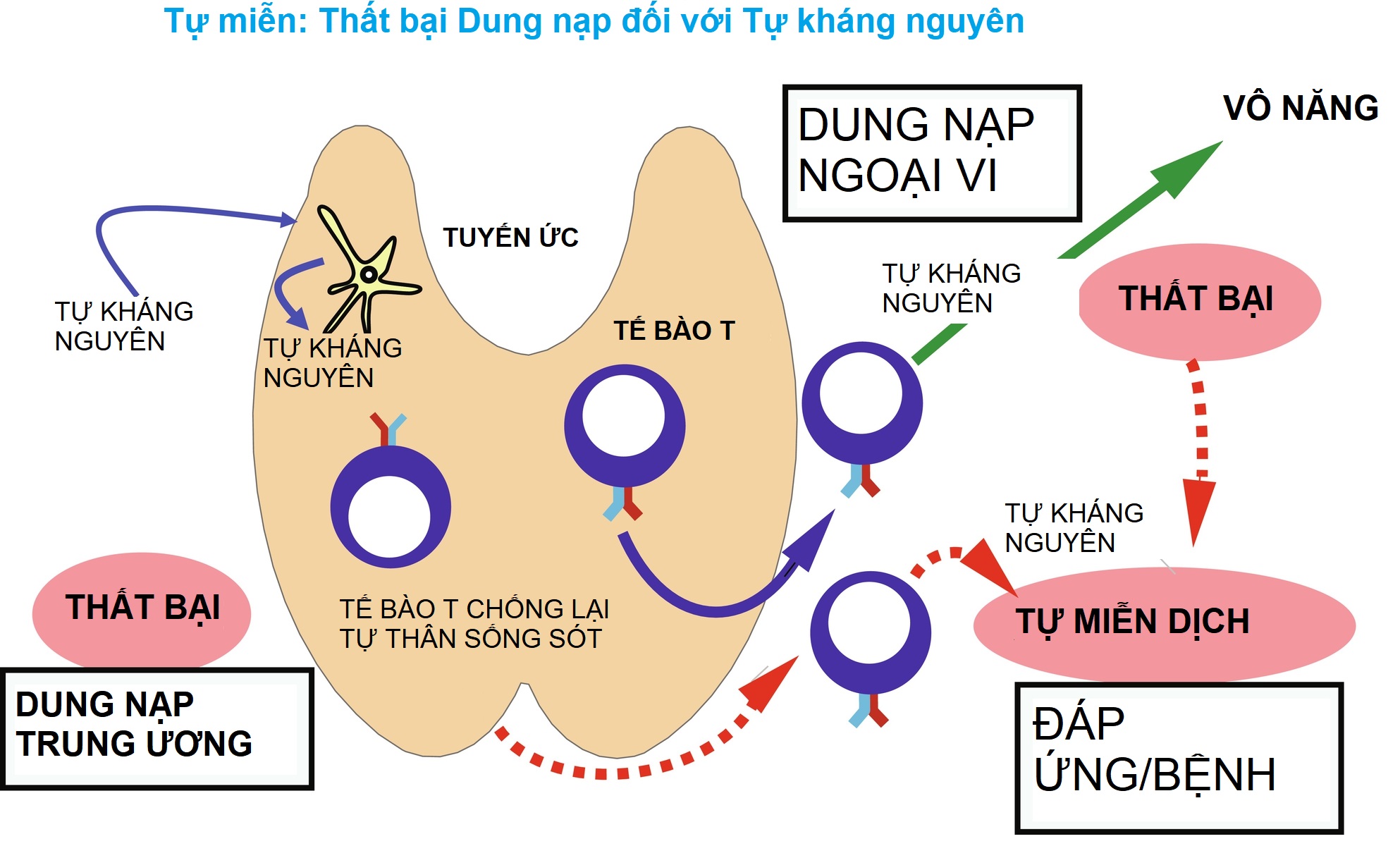 Hình 22.3: Bệnh tự miễn: Thất bại Dung nạp Kháng nguyên Tự thân. Với sự thất bại của dung nạp trung ương (dưới cùng bên trái), các tế bào T chống lại tự thân tồn tại mà bình thường không nên tồn tại. Khi các tế bào T chống lại tự thân như vậy rời khỏi tuyến ức, chúng có thể tạo ra bệnh tự miễn (mũi tên đỏ). Ngoài ra, với sự thất bại của dung nạp ngoại vi (trên cùng bên phải), nếu tình trạng vô năng (mũi tên xanh) không xảy ra sau khi tiếp xúc với kháng nguyên tự thân, một phản ứng hoặc bệnh tự miễn có thể xảy ra (mũi tên đỏ).