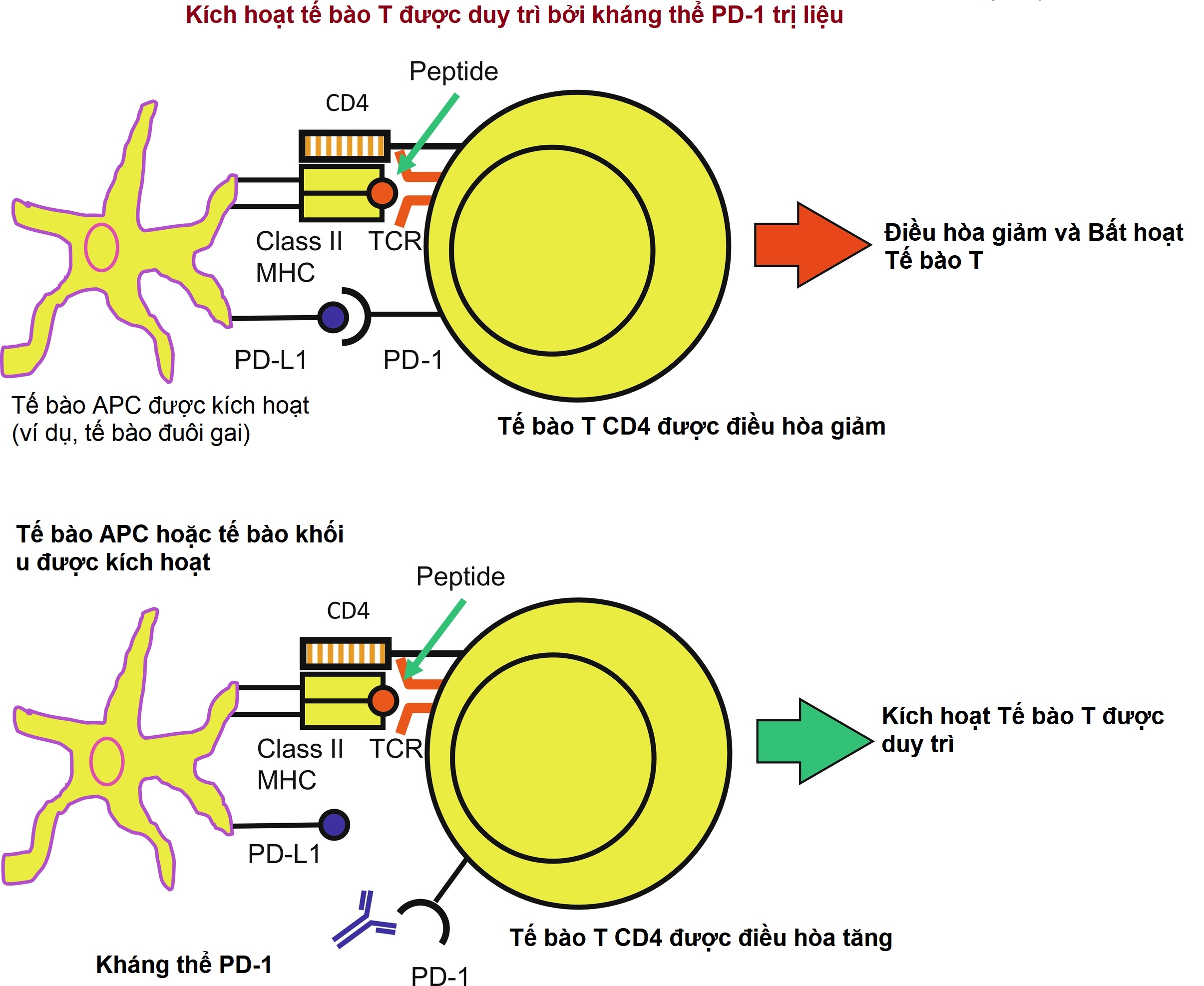 Hình 22.4: Kích hoạt tế bào T được duy trì bởi kháng thể PD-1 trị liệu. Trong khi sự liên kết của PD-L1 trên một APC với PD-1 (hình ảnh) làm giảm hoạt động của các tế bào T được kích hoạt (tế bào T CD4 trong hình vẽ này; nửa trên của hình), sự can thiệp vào tín hiệu PD-1:PD-L1 thông qua một kháng thể đơn dòng trị liệu đối với PD-1 (như hình ảnh) hoặc thông qua một kháng thể đơn dòng trị liệu đối với PD-L1 sẽ duy trì sự kích hoạt tế bào T (nửa dưới của hình). Thật vậy, các kháng thể đơn dòng trị liệu chống PD-1 và chống PD-L1 đã tạo ra những kết quả có lợi đáng kể trong điều trị một số bệnh ung thư.
