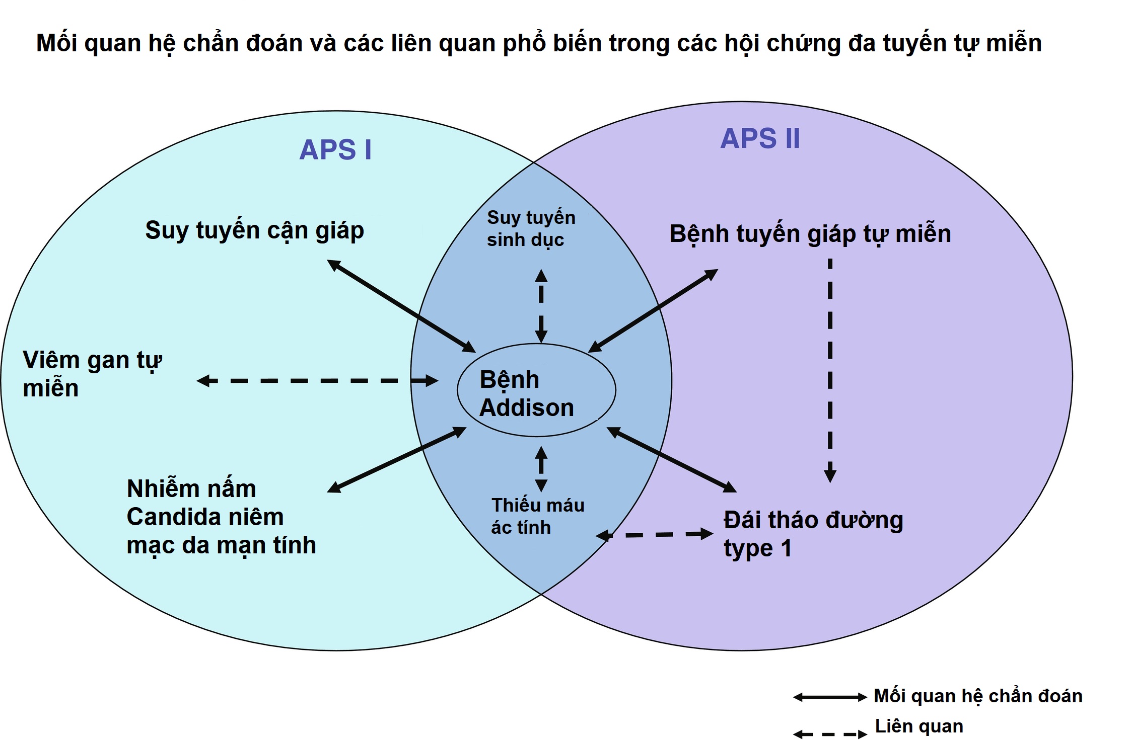 APS I, còn được gọi là bệnh đa nội tiết-nấm candida-loạn dưỡng ngoại bì tự miễn (APECED) là một rối loạn di truyền lặn trên nhiễm sắc thể thường được đặc trưng bởi một số rối loạn tự miễn với sự không đồng nhất đáng kể trong biểu hiện của nó. Hội chứng này là do một đột biến trong gen AIRE trên nhiễm sắc thể 21q22.3. Sự hiện diện của hai trong ba tình trạng sau đây là điều kiện tiên quyết để chẩn đoán APS I: (1) suy vỏ thượng thận (bệnh Addison) hoặc bằng chứng huyết thanh học về viêm tuyến thượng thận (tự kháng thể tuyến thượng thận), (2) suy tuyến cận giáp, và (3) nhiễm nấm candida niêm mạc da mạn tính. APS II được định nghĩa bởi sự cùng tồn tại của ít nhất hai trong ba bệnh nội tiết sau: (1) suy vỏ thượng thận tự miễn hoặc bằng chứng huyết thanh học về viêm tuyến thượng thận, (2) viêm tuyến giáp tự miễn, và/hoặc (3) đái tháo đường tuýp 1 hoặc bằng chứng huyết thanh học về tự miễn dịch đảo tụy. Theo truyền thống, sự xuất hiện của bệnh tuyến giáp và tuyến thượng thận tự miễn đã được gọi là hội chứng Schmidt, trong khi một bộ ba hoàn chỉnh của tự miễn dịch tuyến thượng thận, tuyến giáp, và đảo tụy (hoặc đái tháo đường tuýp 1) đã được gọi là hội chứng Carpenter (Hình 22.5). Sự hiện diện của viêm tuyến giáp, không có bệnh tuyến thượng thận, nhưng liên quan đến đái tháo đường tuýp 1, thiếu máu ác tính, bạch biến, hoặc rụng tóc đã được một số tác giả gọi là APS III, trong khi các sự kết hợp bổ sung của bệnh tự miễn đã được gọi là APS IV (tức là, bạch biến cộng với rụng tóc, đái tháo đường tuýp 1 cộng với bệnh celiac, hoặc đái tháo đường tuýp 1 và bạch biến). Do chúng có chung các gen nhạy cảm và các đặc điểm miễn dịch tương tự, các phân nhóm này thường được coi là sự mở rộng của APS II và không nhất thiết là các thực thể riêng biệt.
