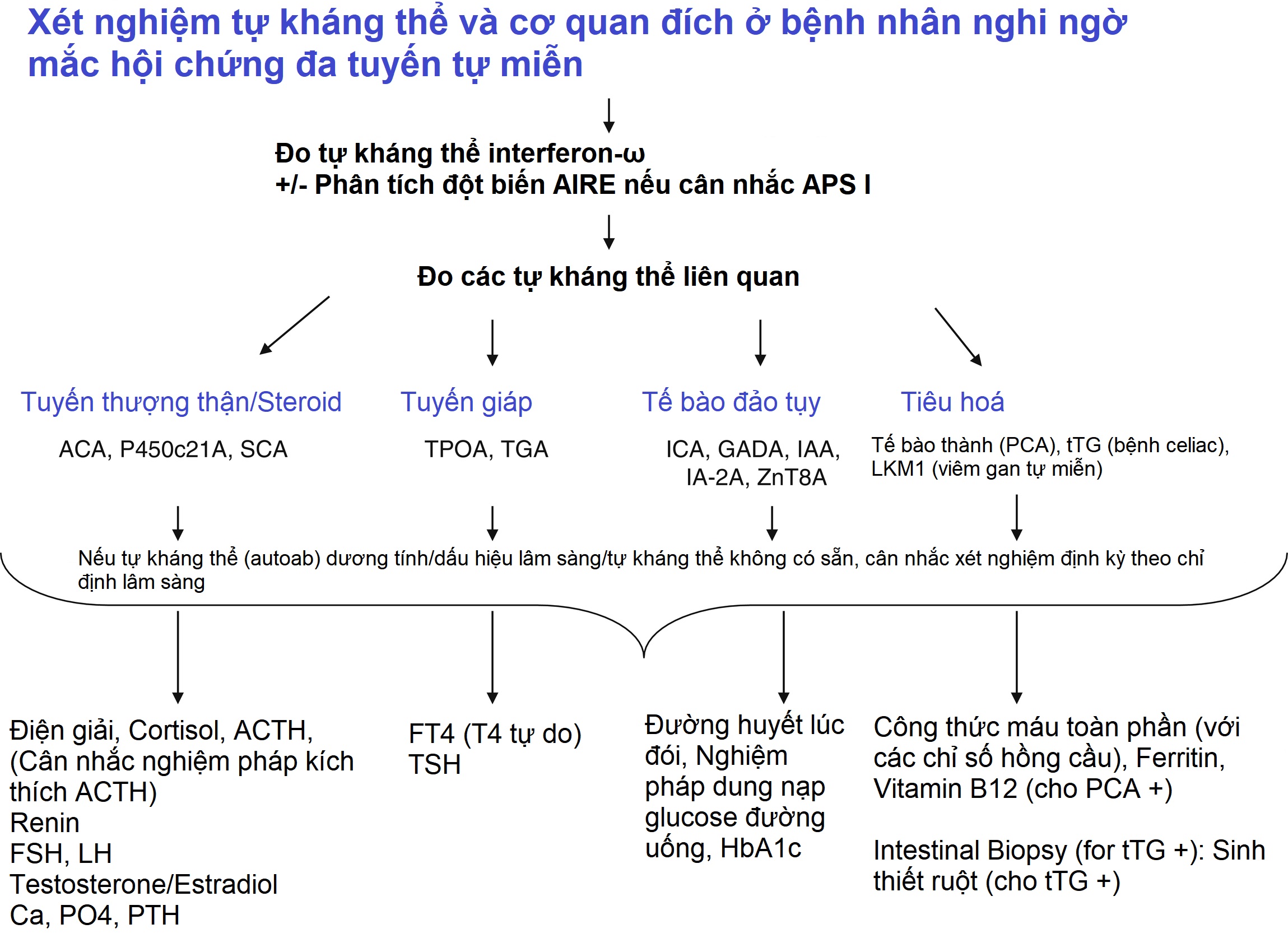 Như đã thảo luận sau đây, có lẽ thành tựu lớn nhất trong thập kỷ qua là việc phát hiện ra mối liên quan giữa các tự kháng thể đối với interferon loại 1 và APS I, cho phép chẩn đoán sớm bệnh nhân APS I. Mặc dù không chỉ ra sự tấn công miễn dịch đặc hiệu mô, các tự kháng thể đối với interferon (α và ω) cung cấp một xét nghiệm sàng lọc có độ nhạy và độ đặc hiệu gần 95% đến 100% cho APS 1. Sự hiện diện của các tự kháng thể đối với interferon nên được theo sau bằng xét nghiệm xác nhận các đột biến AIRE, cũng như xét nghiệm các tự kháng thể đặc hiệu mô khác (Hình 22.6). Chúng bao gồm các tự kháng thể tế bào chất của 21-hydroxylase hoặc vỏ thượng thận (đối với bệnh Addison tự miễn), GADA, các tự kháng thể liên quan đến u đảo tụy (IA-2A), các tự kháng thể insulin (IAA), các tự kháng thể vận chuyển kẽm 8 (ZnT8) (đối với đái tháo đường tuýp 1), các tự kháng thể thyroperoxidase và thyroglobulin (đối với AITD), các tự kháng thể tế bào steroid (đối với suy buồng trứng), và các tự kháng thể transglutaminase (đối với bệnh celiac). Ngoài ra, mặc dù không có sẵn, các tự kháng thể đối với 17-hydroxylase, enzyme cắt chuỗi bên, và 3-hydroxysteroid dehydrogenase có thể được sử dụng để phát hiện tự miễn dịch tuyến sinh dục và tuyến thượng thận. Các tự kháng thể đối với protein 5 lặp lại giàu leucine NACHT (NALP5) và thụ thể cảm nhận canxi cho thấy suy tuyến cận giáp tự miễn tiềm ẩn (CaSR). Tuy nhiên, độ đặc hiệu của CaSR và NALP5 để chẩn đoán suy tuyến cận giáp tự miễn lần lượt là khoảng 83% và 50%, trong khi độ nhạy đã được báo cáo lần lượt là 39% và 26%.