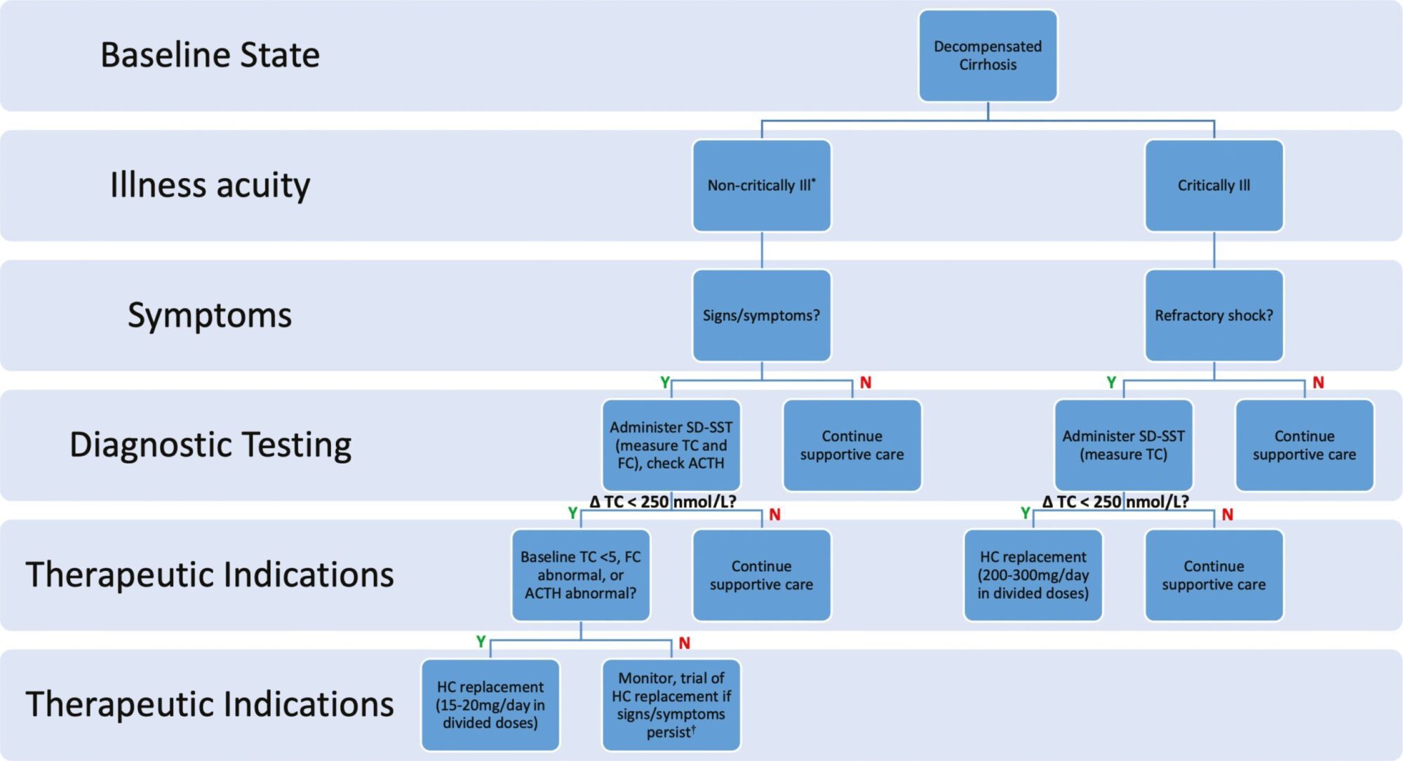 Như đã mô tả trước đây, suy thượng thận tương đối được xác định không đồng nhất. Việc giải thích nồng độ cortisol toàn phần nên phụ thuộc vào xét nghiệm và tính đến mức độ suy giảm tổng hợp gan. Sử dụng delta thay vì cortisol đỉnh cho phép đánh giá năng động hơn về đáp ứng tuyến thượng thận và ít bị ảnh hưởng bởi sự thiếu hụt protein liên kết nền. Mức cortisol toàn phần bất thường có thể nhanh chóng cung cấp chẩn đoán suy thượng thận tương đối tạm thời, mặc dù sẽ có một số lượng đáng kể các kết quả dương tính giả [5]. Khi các mức cortisol huyết tương tự do có sẵn, những mức này có thể hỗ trợ xác nhận hoặc bác bỏ suy thượng thân tương đối. Hiện tại không có đủ bằng chứng để xác định tiện ích của cortisol nước bọt hoặc xét nghiệm dung nạp insulin; Ngoài ra, sau này có thể không an toàn ở những bệnh nhân xơ gan mất bù. Đo đồng thời ACTH huyết tương ban đầu có thể hữu ích để phân biệt giữa đóng góp chính hay phụ cho AI, mặc dù giải thích thận trọng là tối quan trọng đối với bệnh đồng thời (ngay cả khi không nguy kịch). Đo nồng độ DHEAS cũng có thể được xem xét để đánh giá thành phần suy thượng thận trung ương. Tỷ lệ cortisol/DHEAS cao gợi ý về suy thượng thận trung ương vì sự hình thành androgen tuyến thượng thận trong lớp lưới vỏ thượng thận có tác dụng nuôi dưỡng ACTH mạnh và bài tiết androgen bị suy yếu có thể xảy ra trước khi thiếu glucocorticoid [77]. Tuy nhiên, phát hiện này đã được ghi nhận trong một dân số không xơ gan được quản lý LD-SST và giá trị bên ngoài của nó là không rõ ràng.