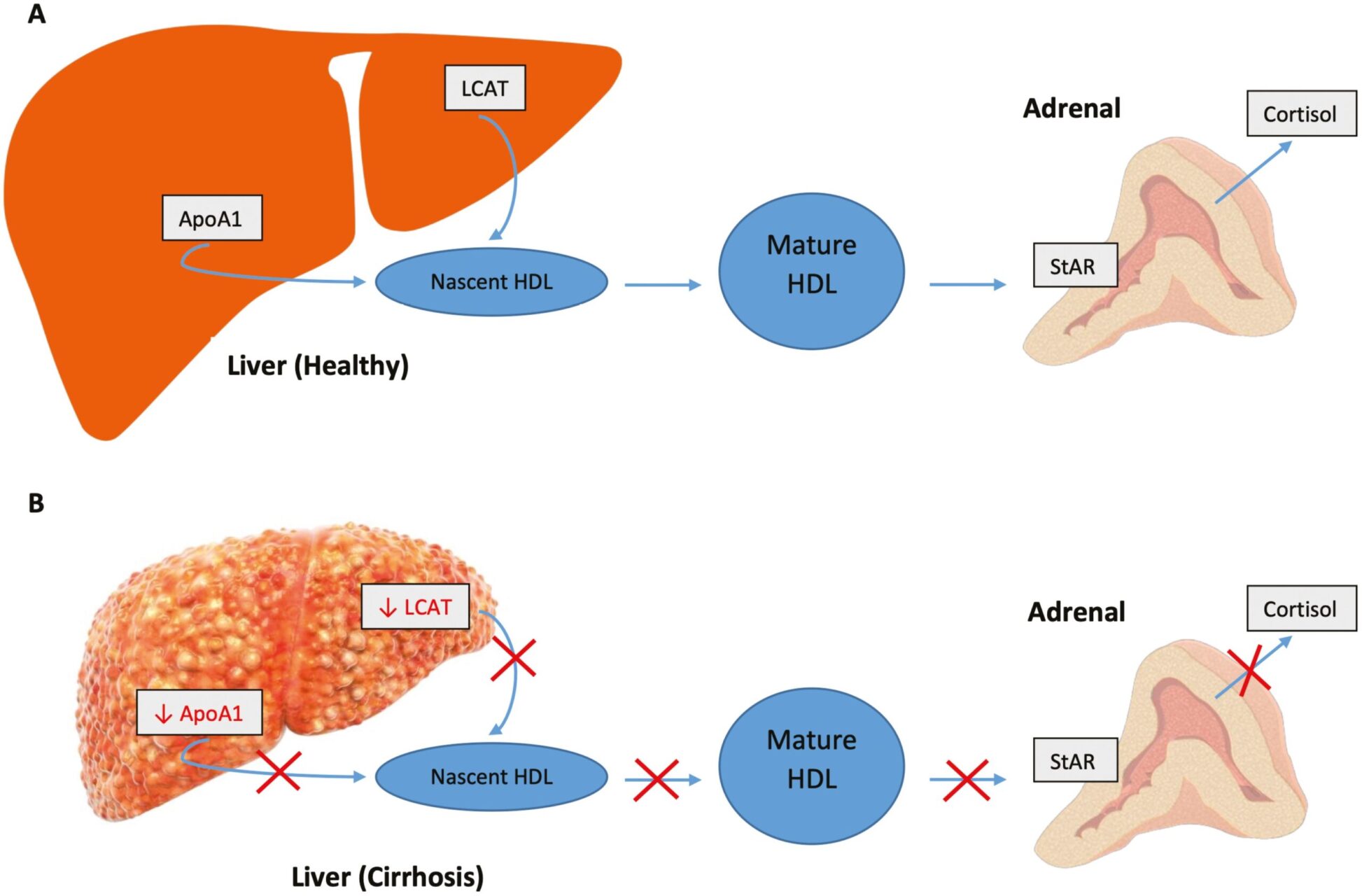 Gan là nơi chính của quá trình tổng hợp apolipoprotein. Một trong những apolipoprotein quan trọng, ApoA1, bao gồm một phần lớn các hạt lipoprotein mật độ cao (HDL). Enzym acyltransferase lecithin-cholesterol có nguồn gốc từ gan (LCAT) liên kết với ApoA1 trên HDL và este hóa cholesterol tự do. Một khi quá trình này hoàn tất, hạt HDL trưởng thành và có thể được chuyển đến các mô ngoại vi. Trong tuyến thượng thận, cholesterol được tháo dỡ và sự hấp thu xảy ra thông qua protein điều hòa cấp tốc steroid ty thể (StAR), đây là bước giới hạn tốc độ trong việc sản xuất hormone steroid (A). Trong xơ gan, quá trình này bị gián đoạn do giảm tổng hợp gan của cả ApoA1 và LCAT, dẫn đến suy giảm sự hình thành các phân tử HDL trưởng thành đầy đủ để cung cấp chất nền đầy đủ cho quá trình tạo steroid tuyến thượng thận bình thường. Tuy nhiên, liệu điều này có dẫn đến giảm đáng kể về mặt lâm sàng trong sản xuất cortisol hay không vẫn chưa được biết (B).