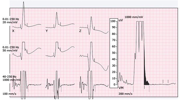ECG tín hiệu trung bình ở bệnh nhân tái cực sớm chứng minh các chỉ số bình thường (khoảng thời gian QRS được lọc 124 ms, khoảng thời gian tín hiệu biên độ thấp tần số cao < 40 microvolts của 37 ms, và căn bậc 2 điện thế bình phương trung bình ở 40 ms cuối là 19 microvolts) và căn bậc hai của bình phương điện thế trung bình ở phần kết thúc là 19 microvolts trong 40 ms.