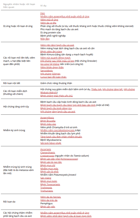 Thứ phát: Thứ phát: do những nguyên nhân không liên quan đến huyết học (xem bảng Các rối loạn quan trọng và điều trị liên quan đến tăng bạch cầu ái toan)