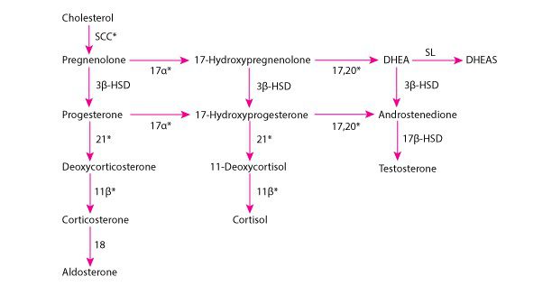 11β = 11β-hydroxylase (P-450c11); 17α = 17α-hydroxylase (P-450c17); 17,20 = 17,20 lyase (P-450c17); 18 = tổng hợp aldosterone (P-450aldo); 21 = 21-hydroxylase (P-450c21); DHEA = dehydroepiandrosterone; DHEAS = DHEA sulfat; 3β-HSD = 3β-hydroxysteroid dehydrogenase (3β2-HSD); 17β-HSD = 17β-hydroxysteroid dehydrogenase (17β-HSD); SCC = sự phân tách chuỗi bên (P-450scc); SL = sulfotransferase (SULT1A1, SULT1E1).