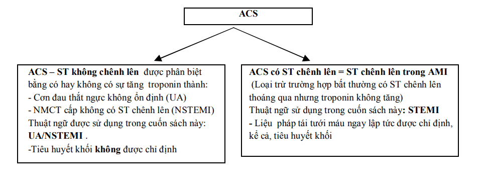 Phân biệt giữa UA và NSTEMI bằng cách xem xét có hay không có sự biểu hiện của tổn thương cơ tim (hoại tử tế bào), được xác định bằng định lượng các marker sinh học cơ tim là troponin I (cTnI) hoặc troponin T (cTnT); nồng độ của các marker sinh học này thỉnh thoảng không tăng trong khoảng từ 6 đến 12 h hoặc dài hơn sau khi khởi phát triệu chứng. Trong hội chứng vành cấp, vùng thiếu máu có nguy cơ dẫn đến nhồi máu. Khi có tắc mạch vành hoàn toàn, phần lớn là STEMI, nếu không có tuần hoàn bên và không có tái tưới máu, vùng nhồi máu là vùng có kích thước lớn trong toàn bộ vùng có nguy cơ. Đối với NSTEMI, vùng thiếu máu có thể hồi phục thường lớn hơn vùng tổn thương không hồi phục. Theo Định Nghĩa, trong UA, nồng độ troponin huyết tương thường là bình thường. Do đó, về cơ bản, tất cả các vùng thiếu máu được chứng minh là có thể phục hồi. Trước đây, AMI được xác định bởi sự tăng của isoenzyme creatine kinase-MB (CK-MB) lớn hơn 2 lần giá trị bình thường trong ngữ cảnh các triệu chứng đã xảy ra 30 phút. CTnI và cTnT nhận biết thêm trên bệnh nhân đã có tổn thương cơ tim (hoại tử tế bào) nhưng lại không có sự tăng của CK-MB. Những bệnh nhân có “tổn thương cơ tim nhỏ” bây giờ được phân loại như là nhồi máu cơ tim cấp dai dẳng. Ước tính rằng có khoảng 30% bệnh nhân trước đây được phân loại là UA bây giờ được phân loại là NSTEMI. Mặc dù cả hai loại này có vùng cơ tim nguy cơ rất lớn, nhưng sự giải phóng ngay cả với một lượng nhỏ troponin tim cũng liên quan đến tỷ lệ lớn hơn về những bất lợi cho tim. Liệu pháp tái tưới máu kể cả liệu pháp tiêu sợi tơ huyết và chụp mạch vành có hoặc không có can thiệp mạch vành qua da (PCI) (chụp mạch vành ± PCI). Liệu pháp tái tưới máu được phân biệt với liệu pháp chống thiếu máu cục bộ khác bởi giá trị, các nguy cơ đáng chú ý (đặc biệt là tiêu sợ tơ huyết) và tính chất xấm lấn của nó (PCI); do đó những liệu pháp này phải được suy xét khi lựa chọn trên bệnh nhân. Một số trường hợp ngoại lệ, tiêu sợi tơ huyết không được chỉ định nếu không có ST chênh lên. Hai thuật ngữ, UA và NSTEMI, được gắn với nhau bởi vì (a) cả hai loại này đều không có chỉ định tái tưới máu; (b) cả NSTEMI và UA đều không có ST chênh lên liên tục; và (c) UA không phân biệt được với NSTEMI bằng lâm sàng cho đến khi giai đoạn muộn hơn, được xác định bởi các marker sinh học. Do đóNhồi máu cơ tim cấp được phân thành STEMI hoặc UA/NSTEMI. Vai trò của ECG trên bệnh nhân có ACS Có hai chức năng chính của ECG trên bệnh nhân có hội chứng vành cấp, đó là: