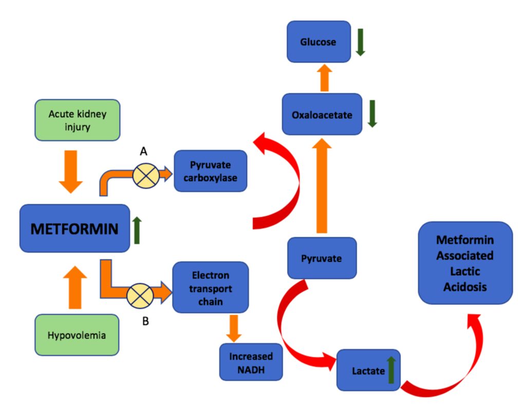 Cơ chế sinh lý bệnh: Các cơ chế chính xác mà metformin gây ra nhiễm toan lactic không được hiểu rõ. Tuy nhiên, nó được cho là có liên quan đến sự ức chế phosphoryl hóa oxy hóa ty thể do metformin gây ra, dẫn đến sự tích tụ lactate.