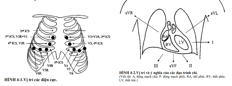 Vị trí các đạo trình và tư thế bệnh nhân chuẩn là rất quan trọng khi ghi ECG. Ghi thấp hơn hoặc cao hơn 1 khoang gian sườn, hoặc bệnh nhân đứng thay vì nằm, có thể làm thay đổi rõ phức bộ QRST. Vị trí các đạo trình được chỉ ra ở hình 4-1.