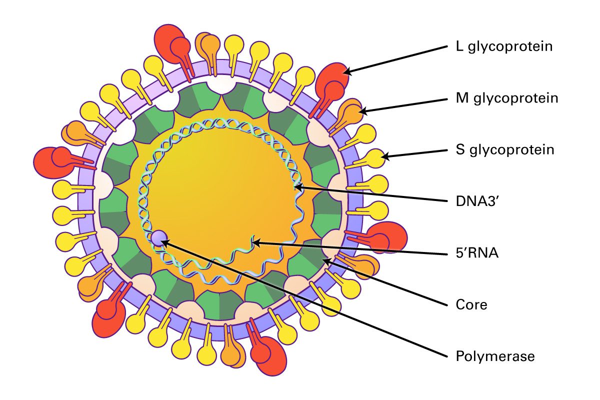 3. Bộ gen của virus: Bên trong nucleocapsid là bộ gen của virus, bao gồm một phân tử DNA vòng tròn (rcDNA) sợi đôi, có chiều dài khoảng 3,2 kb. RCDNA có một chuỗi trừ (-) hoàn chỉnh và một chuỗi cộng (+) không đầy đủ, có một khoảng trống trên chuỗi cộng. Đầu 5′ của sợi âm được liên kết cộng hóa trị với polymerase của virus.