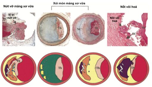 Hình 1: Trên, bên trái: Nứt vỡ mảng xơ vữa, cho thấy lớp phủ xơ bị vỡ kèm huyết khối (Th) lòng mạch, lõi hoại tử (NC) lớn thông với lòng mạch máu. Trên, ở giữa: Xói mòn mảng xơ vữa ở sang thương giàu proteoglycans và tế bào cơ trơn, huyết khối (Th) bám vào vùng bị mất nội mạc, những sang thương này có ít tế bào viêm, ít bạch cầu đơn nhân. Trên, bên phải: nốt vôi hoá chồi vào lòng mạch thông qua lớp phủ xơ bị nứt. Dưới: sơ đồ đặc điểm khác biệt giữa nứt vỡ mảng xơ vữa và xói mòn mảng xơ vữa. Theo Virmani và cs., Peter Libby và cs.[10]