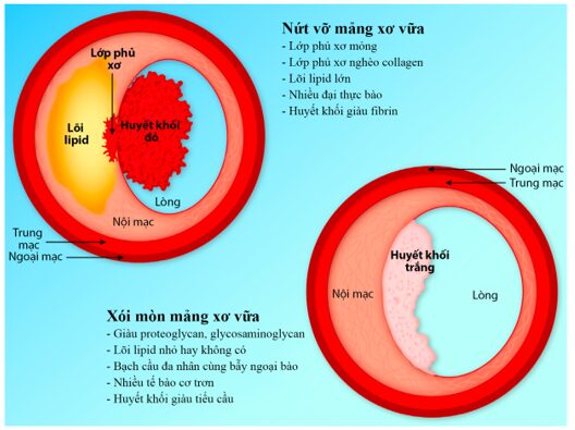Về lý thuyết, có 3 cơ chế gây hội chứng vành cấp đã được đề xuất gồm: (1) Nứt vỡ mảng xơ vữa, cơ chế thường gặp nhất, thường là biến chứng của mảng xơ vữa có lõi giàu lipid, lớp phủ xơ bề mặt mỏng (Hình 1), khi vỡ gây hoạt hóa tiểu cầu và thành lập huyết khối, nhưng đôi khi xảy ra ở vị trí xơ vữa có nốt vôi hoá bên dưới, (2) Xói mòn mảng xơ vữa, trong đó huyết khối thành lập ở vùng nội mạc bị bóc mòn cạnh mảng xơ vữa, không có hiện tượng vỡ lớp phủ xơ bề mặt mảng xơ vữa, (3) Hội chứng vành cấp xảy ra không có hình thành huyết khối. Một số tác giả phân nốt vôi hoá là sang thương gây huyết khối cấp riêng, không thuộc nhóm nứt vỡ mảng xơ vữa – như vậy có 3 cơ chế tạo huyết khối cấp: nứt vỡ mảng xơ vữa, nốt vôi hoá, xói mòn mảng xơ vữa (Hình 1).