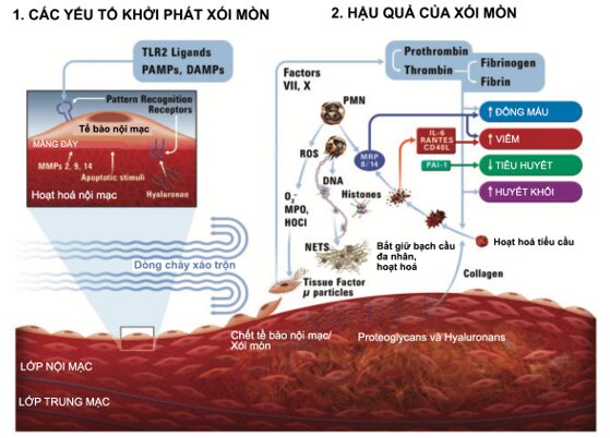 Không như nứt vỡ mảng xơ vữa, xói mòn mảng xơ vữa chưa được miêu tả kĩ [14]. Nhìn chung, xói mòn mảng xơ vữa xảy ra ở những sang thương giàu proteoglycans, cơ trơn mà mất đi lớp nội mạc. Quá trình xói mòn diễn tiến có thể theo 2 bước (hình 2). Bước đầu tiên, do xáo trộn dòng máu quanh mảng xơ vữa, thụ thể toll-like receptor 2 được hoạt hóa dẫn đến chết tế bào nội mạc, mất lớp nội mạc trên bề mặt mảng xơ vữa. Bước tiếp theo, bẫy ngoại bào bạch cầu đa nhân trung tính hình thành trên bề mặt lòng mạch bị mất nội mạc, hoạt hóa hình thành huyết khối, trong đó các tế bào miễn dịch thích ứng như T CD8+ có thể góp phần xói mòn. Cơ chế này khác với với cơ chế bệnh của nứt vỡ mảng xơ vữa, gồm kích hoạt quá trình viêm tại chỗ và toàn thân, huyết khối kích hoạt bởi yếu tố mô, tham gia chủ yếu của đại thực bào hơn bạch cầu đa nhân [1, 21].