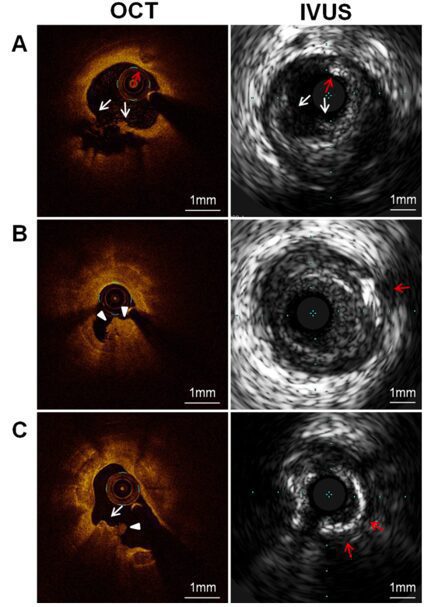 Hình 4: Hình ảnh cắt lớp quang kết mạch vành (OCT) và siêu âm nội mạch vành (IVUS) của các sang thương khác nhau. (A) Nứt vỡ mảng xơ vữa: mất liên tục lớp phủ xơ (mũi tên trắng), lõi lipid lớn (hướng 1-10 giờ), nốt canxi rải rác (mũi tên đỏ). (B) Xói mòn mảng xơ vữa: OCT cho thấy huyết khối trắng (đầu mũi tên trắng) ở bề mặt lòng mạch, không thấy hình ảnh mất liên tục lớp phủ xơ, IVUS cho thấy nốt canxi hoá ở xa (mũi tên đỏ). (C) Nốt vôi hoá: OCT cho thấy canxi hoá dạng lõm (mũi tên trắng) kèm huyết khối trắng (đầu mũi tên trắng), IVUS cho thấy mảng canxi lớn gần bề mặt lòng mạch (mũi tên đỏ) (35).